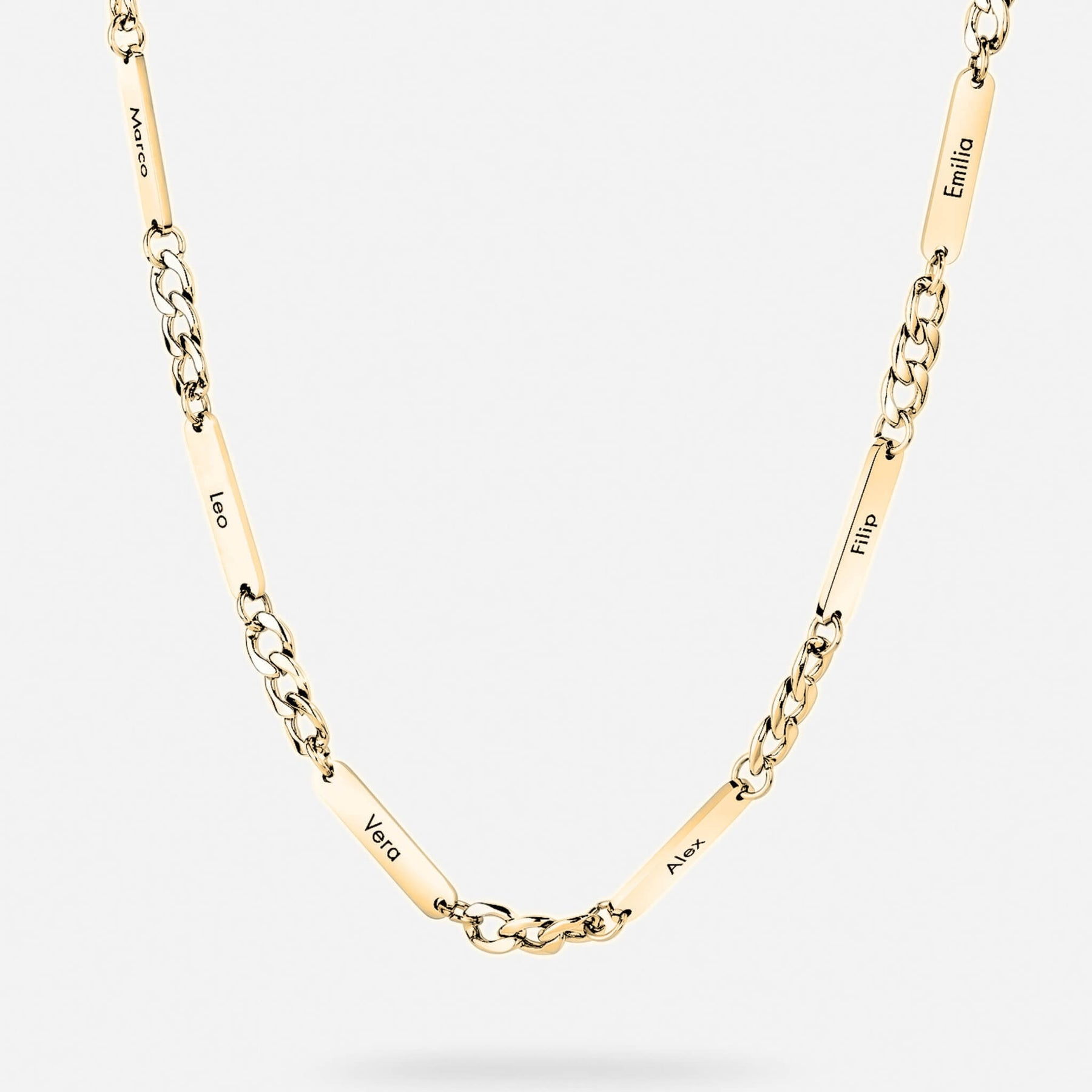 Each bar can be engraved with a name, date, or word — a subtle way to keep what matters most always close. Made for daily wear, the Personalised Name Link Necklace blends bold design with sentimental value.